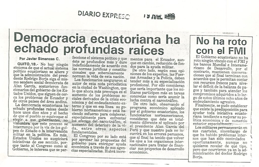 Por Javier Simancas C.(Juan de la Luna S.) DIARIO EL TIEMPO DE QUITO, 8 DE JULIO DE 1978 Contra viento y marea Oír hablar en términos como “…vamos a implantar la justicia social con libertad”; “en mi Gobierno se impondrá la Nueva Democracia”; “haremos la redistribución geográfica del ingreso…”; “Vamos…
